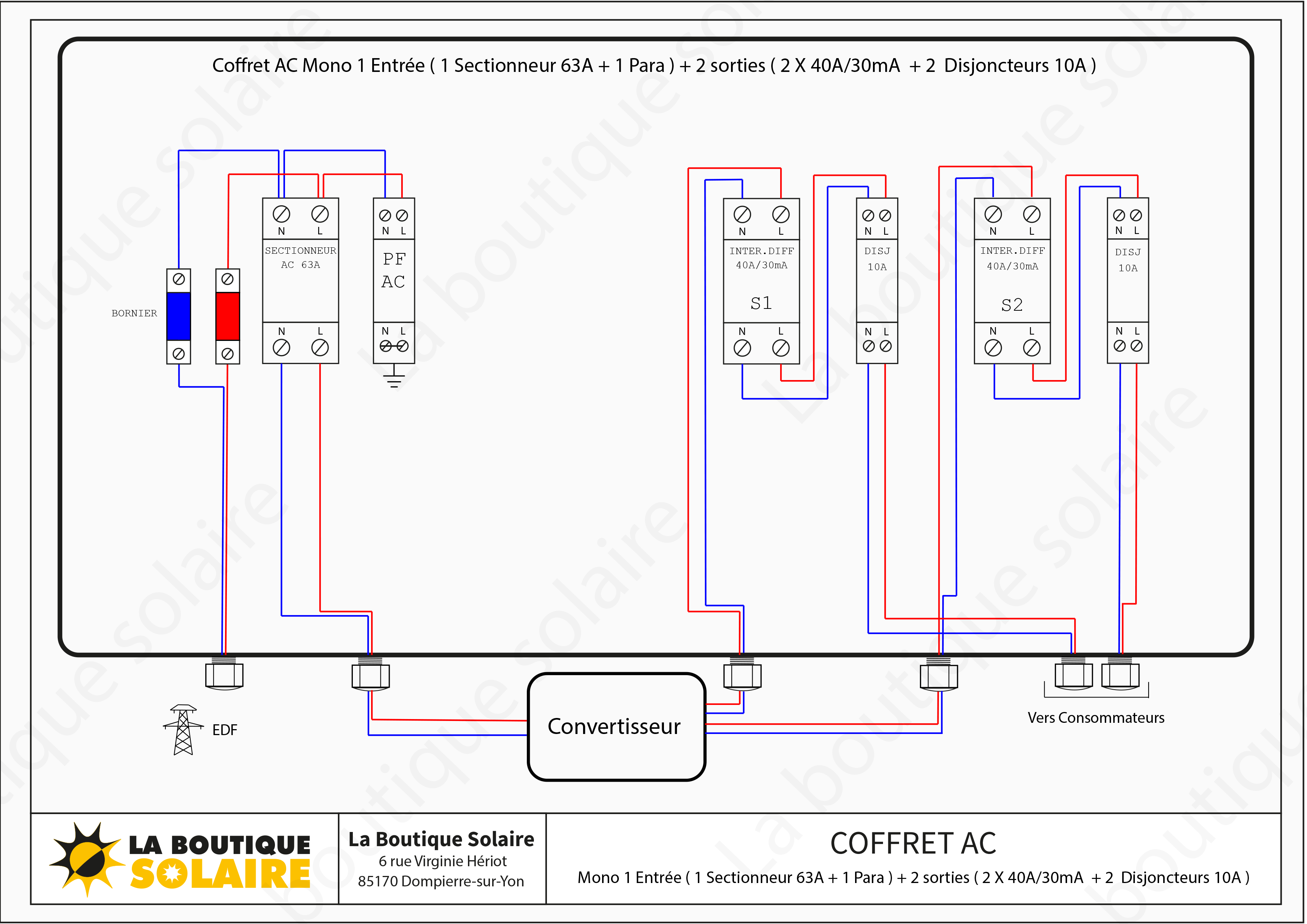 Coffret AC Mono 1 entrée (1 Sectionneur 63A + 1 para) + 2 sorties (2 x 40A/30mA + 2 x Disjoncteurs 10A)