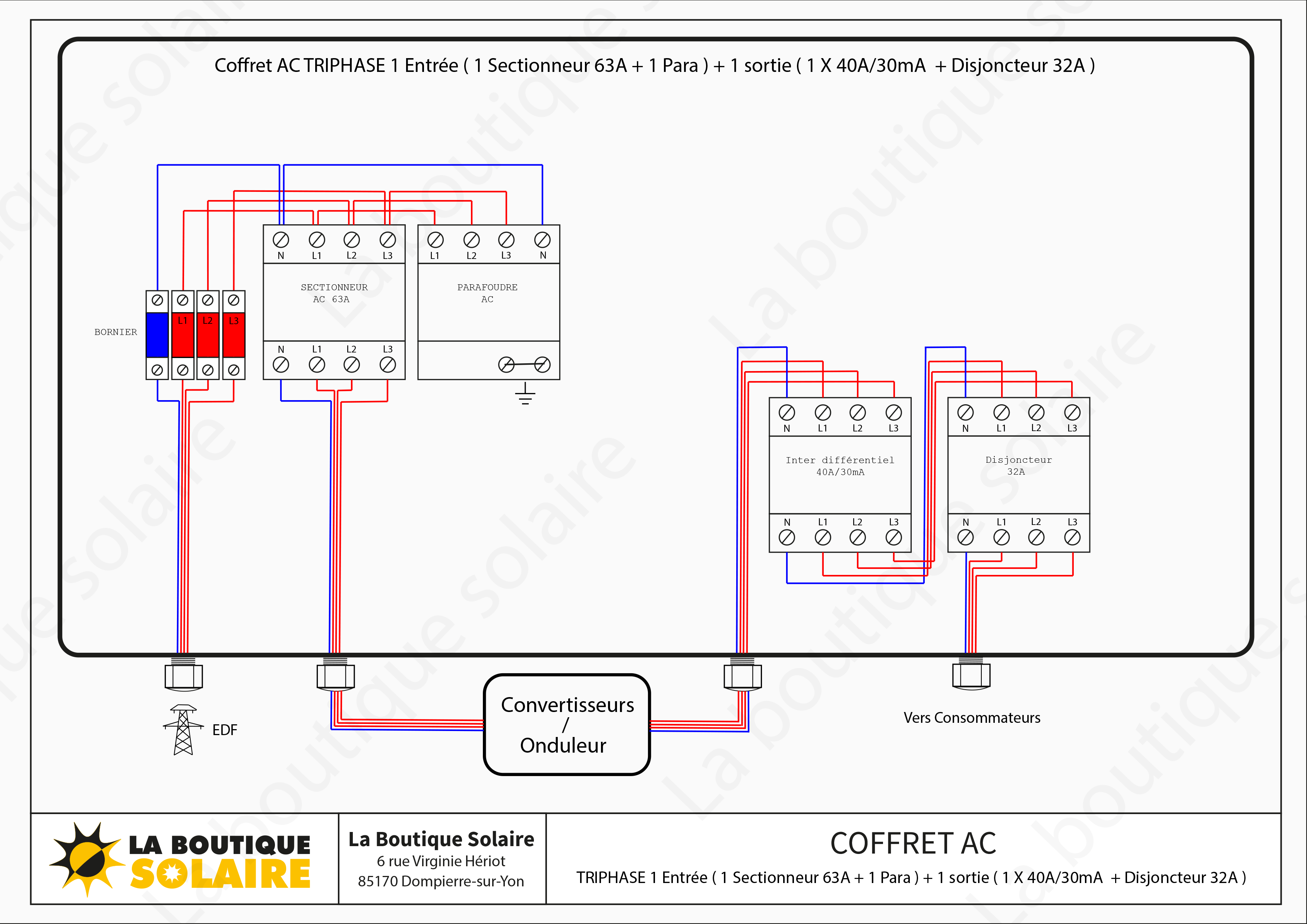 Le coffret AC triphasé peut être composé d'un sectionneur + parafoudre entre l'EDF et l'onduleur ainsi qu'un inter-différentiel et un disjoncteur pour protéger la sortie du tableau électrique.
