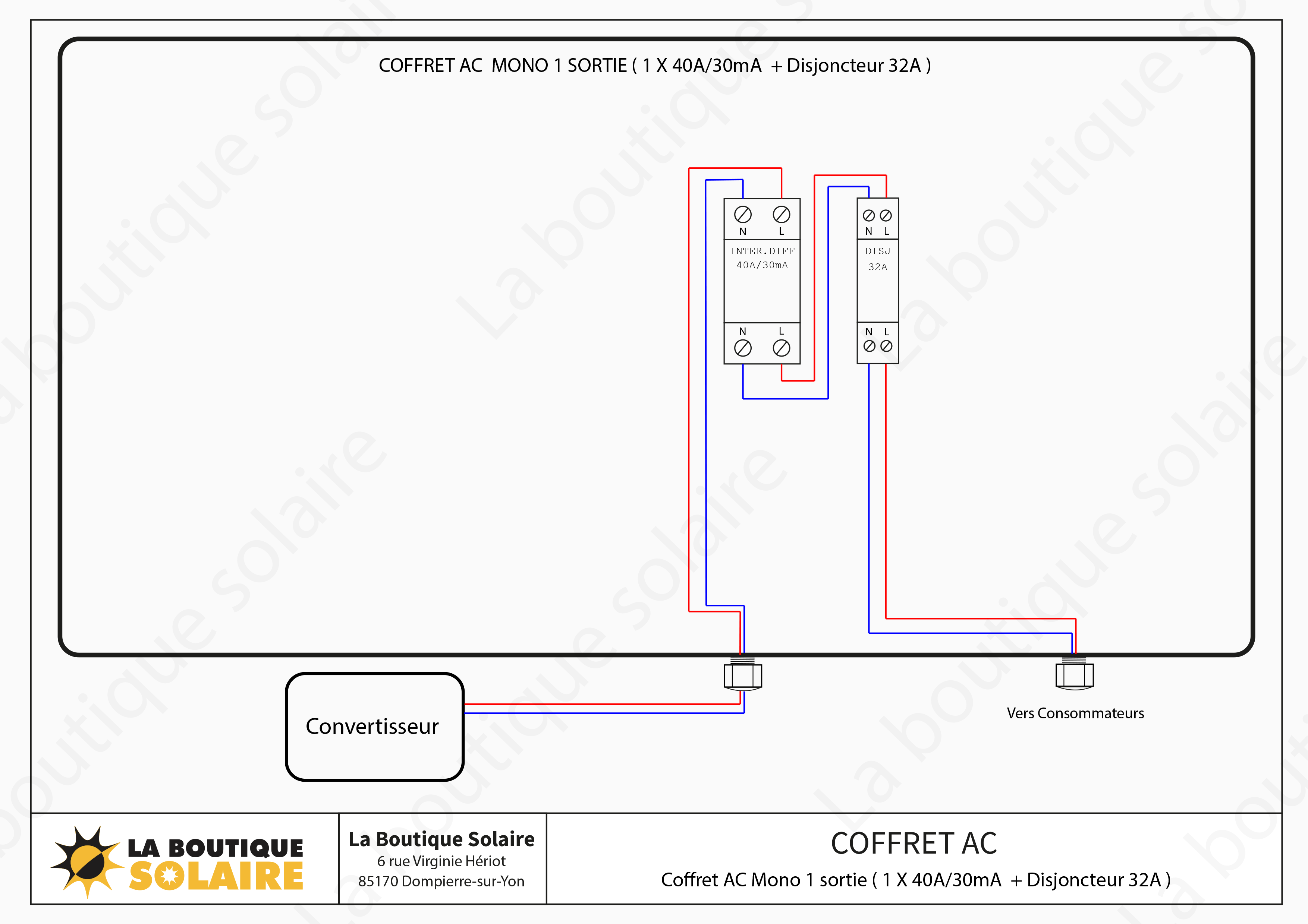 Le coffret AC triphasé peut être composé d'un sectionneur + parafoudre entre l'EDF et l'onduleur ainsi qu'un inter-différentiel et un disjoncteur pour protéger la sortie du tableau électrique.