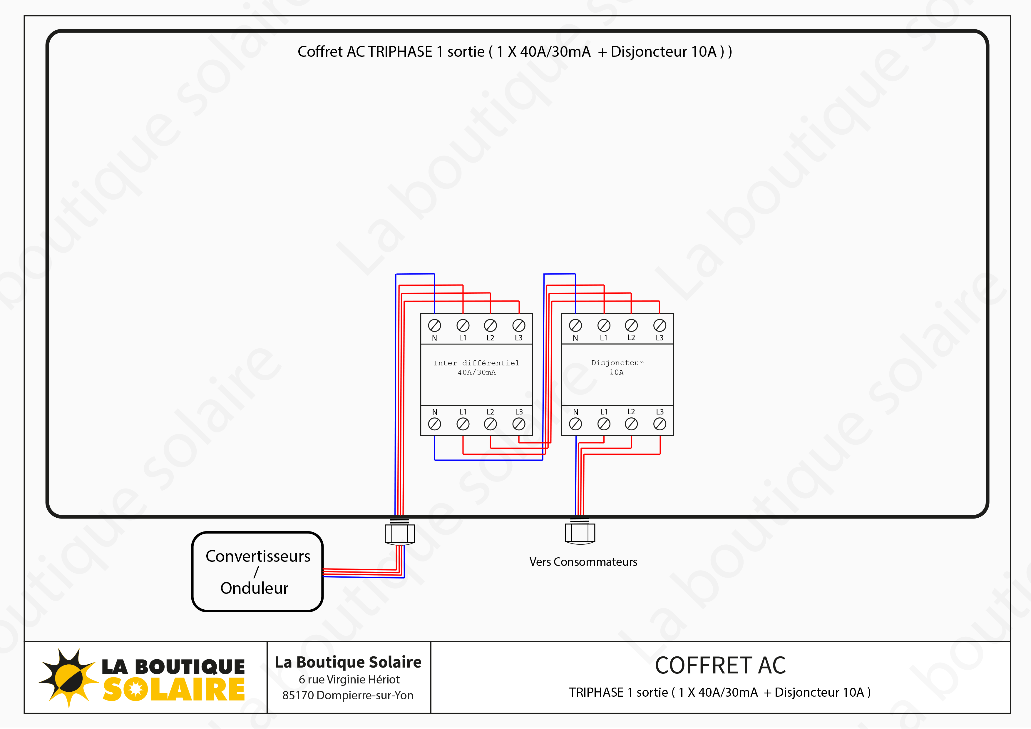 Le coffret AC triphasé peut être composé d'un sectionneur + parafoudre entre l'EDF et l'onduleur ainsi qu'un inter-différentiel et un disjoncteur pour protéger la sortie du tableau électrique.