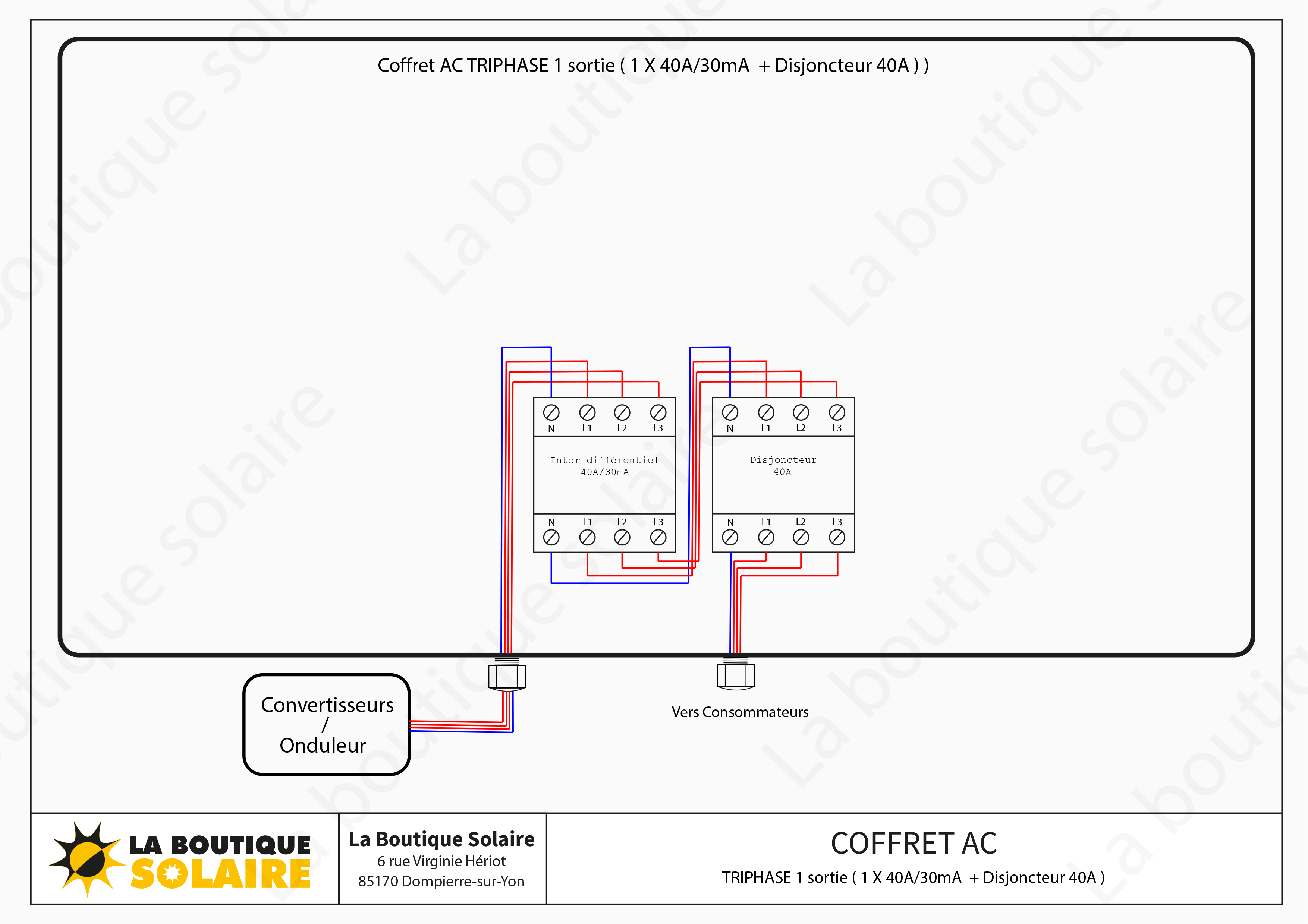 Le coffret AC triphasé peut être composé d'un sectionneur + parafoudre entre l'EDF et l'onduleur ainsi qu'un inter-différentiel et un disjoncteur pour protéger la sortie du tableau électrique.