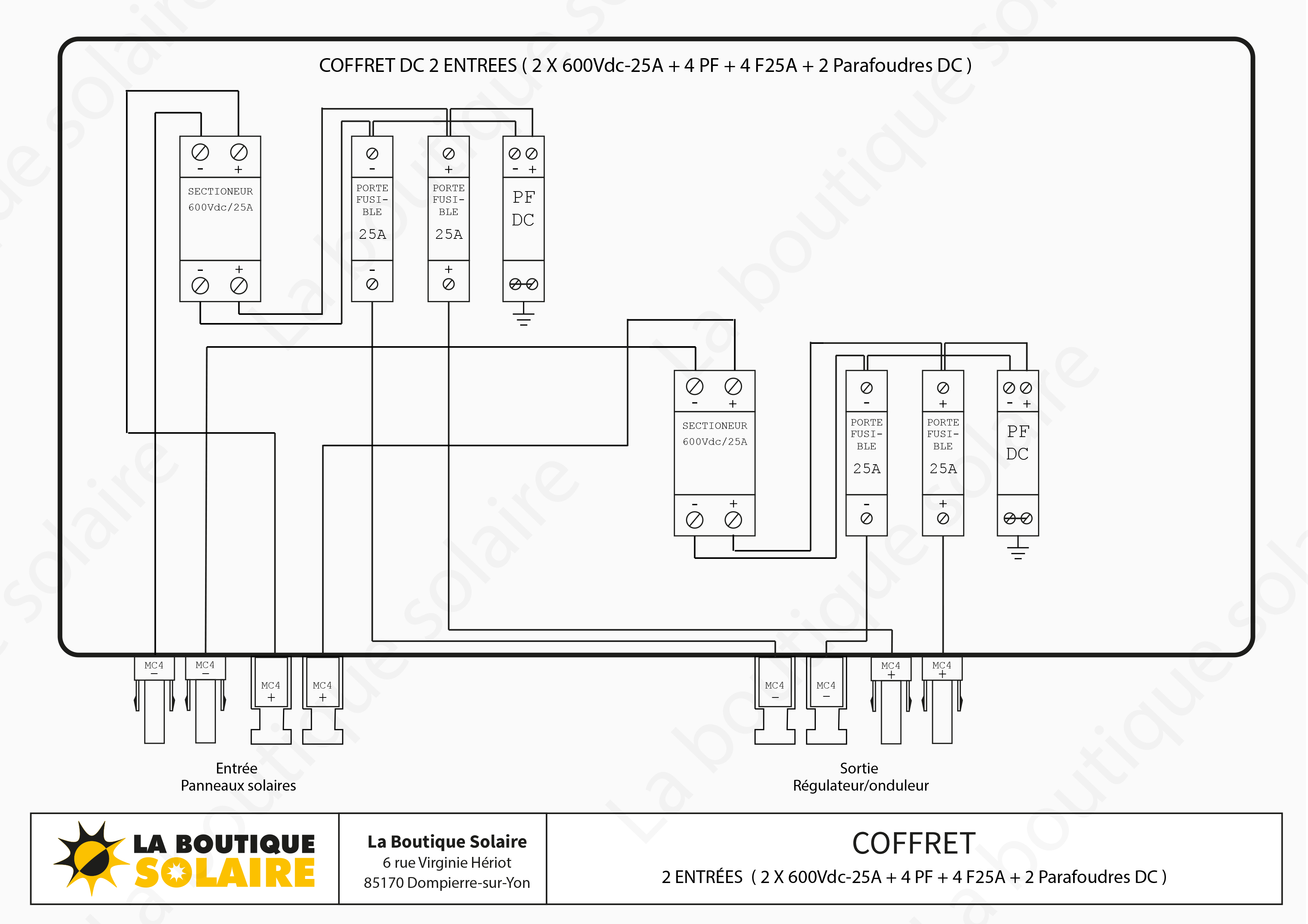 Coffret DC 2 entrées (2 x 600Vdc-25A + 4 PF + 4 F25A + 2 Parafoudres DC)
