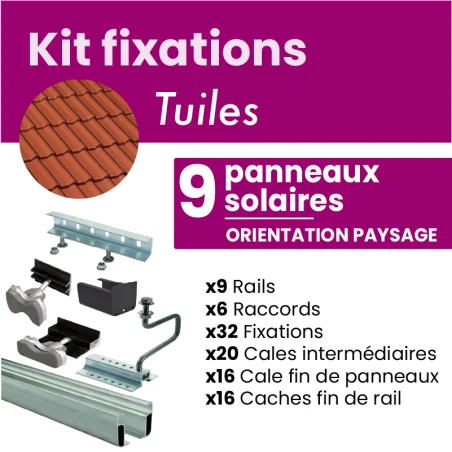 Ce kit a spécialement été conçu pour fixer jusqu'à 9 panneaux solaires sur des tuiles mécaniques. Il permettra une attache sûre et solide de vos panneaux sur votre toit.