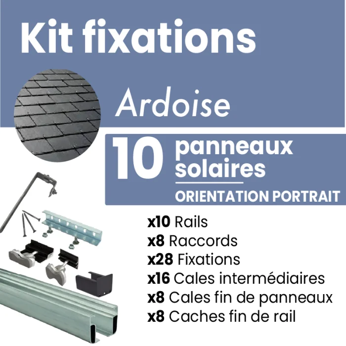 Ce kit a spécialement été conçu pour fixer 10 panneaux solaires sur une toiture en ardoise. Il permettra une attache sûre et solide de vos panneaux sur votre toit.