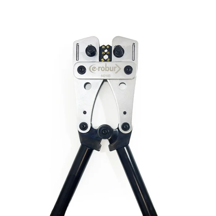 Cet outil a spécialement été conçu pour le sertissage de cosses tubulaires de sections allant de 6 à 120 mm2. Il dispose de 9 matrices rotatives que vous pourrez moduler librement : la pince est équipée d'un système à barillet permettant un sertissage hexagonal.