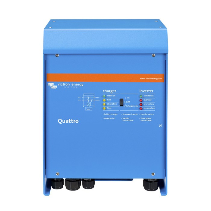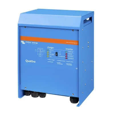 Il permet de convertir la tension des batteries en tension réseau 230V avec une puissance de sortie de 8000 Va semblable au MultiPlus,le Quattro combine également un ensemble convertisseur et chargeur.