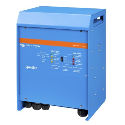 Il permet de convertir la tension des batteries en tension réseau 230V avec une puissance de sortie de 8000 Va semblable au MultiPlus,le Quattro combine également un ensemble convertisseur et chargeur.