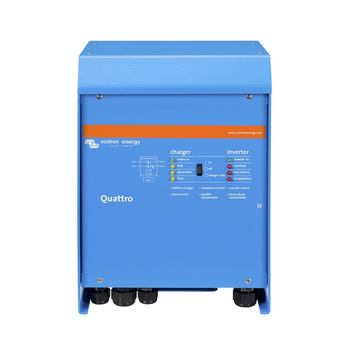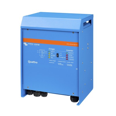 Il permet de convertir la tension des batteries en tension réseau 230V avec une puissance de sortie de 8000 Va semblable au MultiPlus,le Quattro combine également un ensemble convertisseur et chargeur.